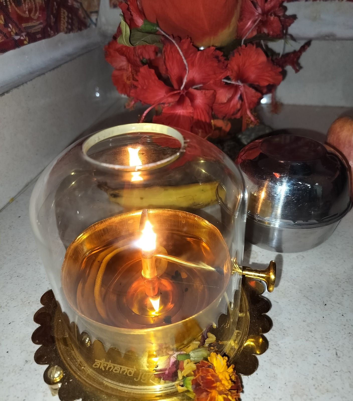 Noted that the glass chimney prevented flame flicker during outdoor puja.