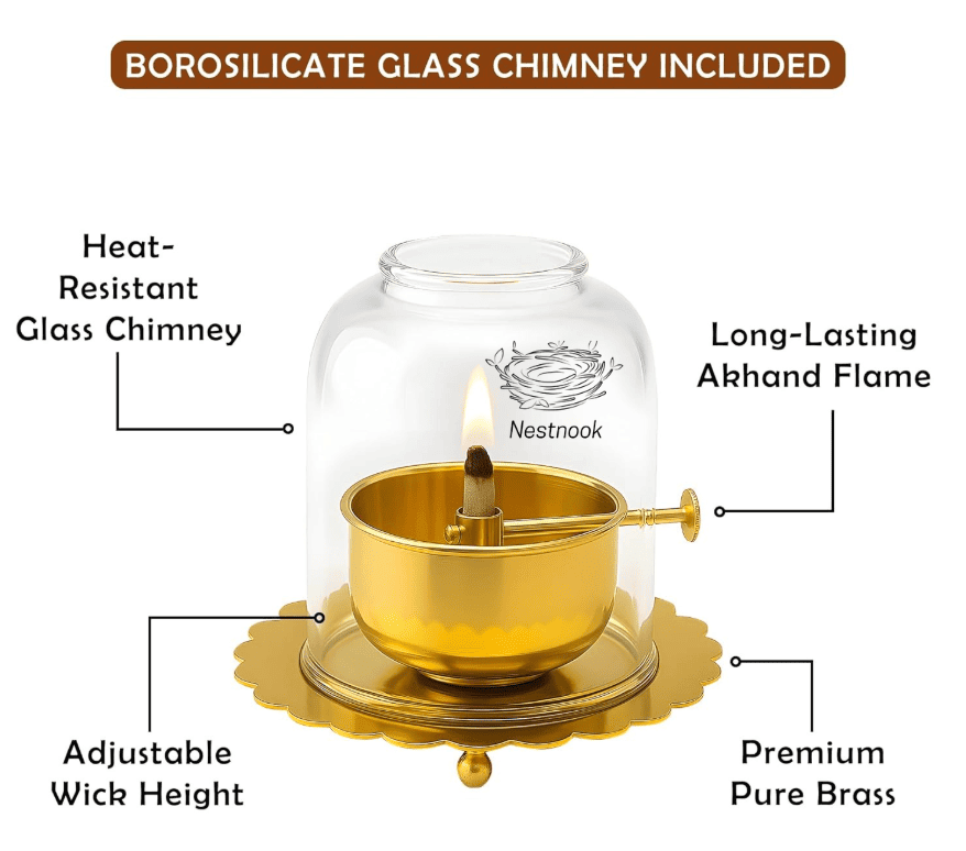 The borosilicate glass chimney protects the flame from winds so your akhand jyoti stays lit. Enjoy uninterrupted prayers, morning Aarti, and long ceremonies without rushing to relight the lamp.